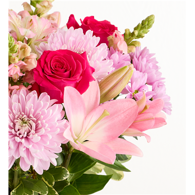 Thank Mom for a lifetime of comforting hugs with our Mother’s Embrace™ bouquet. Lovely pink and lavender blooms are hand-designed in a glass vase tied with a pink satin ribbon, creating a heartfelt expression of your feelings, whether you're celebrating Mother’s Day together or sending a smile from miles away.